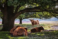 Een Schotse Hooglander koe komt kijken bij drie andere koeien die een rustpauze hebben.