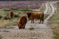 Schotse hooglander op de Wezepsche heide s morgens vroeg. De heide is in bloei.