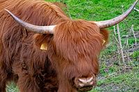 Een volwassen hooglander in een rustige stemming.Onderdeel uitmakend van een kudde van ongeveer 20 dieren.Ze hebben een groot leefgebied op de landtong wat hun gezondheid ten goede komt.