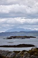 Schotse wateren onderbroken door rotseilandjes leiden naar de bergen met kleine witte huisjes in een dorp.