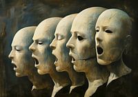 Elk hoofd lijkt te schreeuwen, met de monden wijd open, als een stil protest tegen de onbekende krachten die hen omringen. De uitdrukking op hun gezichten is intens en wanhopig, alsof ze worstelen met innerlijke demonen of een onuitsprekelijke angst.
