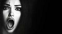 Zwart-wit afbeelding van een jonge vrouw met lang, donker haar die schreeuwt met haar mond wijd open in een uitdrukking van angst en schrik. De afbeelding vangt een sterke emotie en een intens gevoel van angst, versterkt door het contrast van de monochrome stijl.