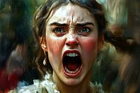 Dit krachtige olieverfschilderij toont een jonge vrouw met een boze uitdrukking op haar gezicht, schreeuwend met haar mond open - een intens moment van rauwe emotie. Haar ogen glinsteren van woede, haar gelaatstrekken zijn gespannen, elk detail brengt de explosieve kracht van frustratie, pijn en innerlijke rebellie over.