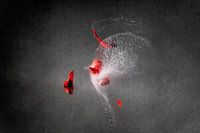 Snelle opname van rode ballondelen en waterdruppels die wegspatten na een schot op een donkere achtergrond