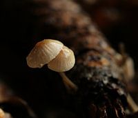 Twee kleine paddenstoelen verstrengeld met elkaar.
