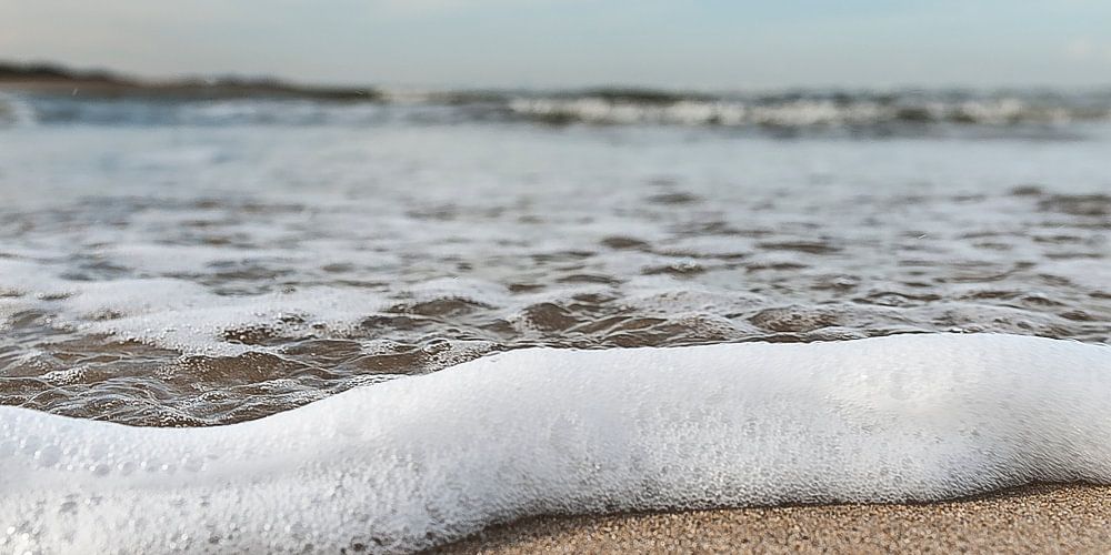 Lage opname van door het tij opgeduwd schuim op het strand.