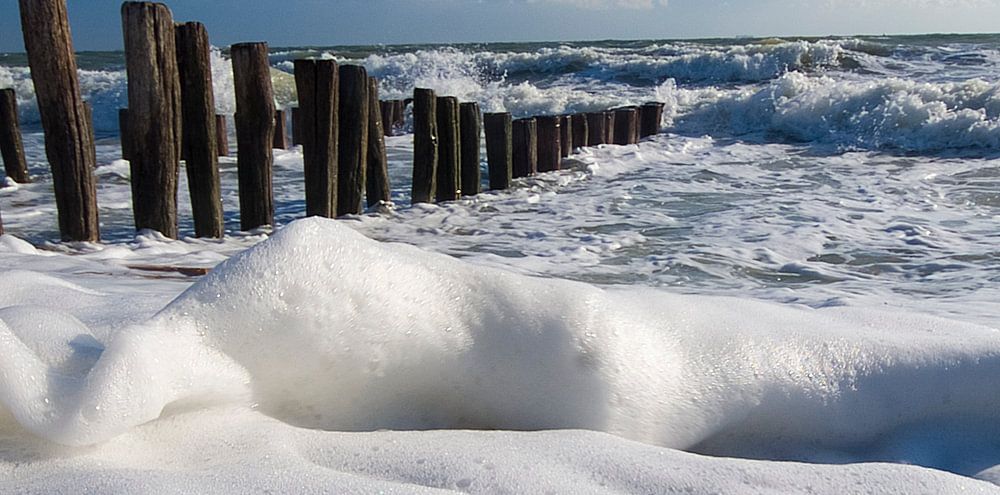 Tijdens de zomer kunnen er mooie golven en schuim tegen de palen botsen