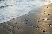 Zachte golven bereiken het zandstrand. Stenen liggen verspreid langs de kust en het natte zand weerspiegelt het subtiele licht van de ondergaande zon. Schuimend water laat natuurlijke structuren achter op het strand en vormt een prachtig contrast met het glanzende zand.