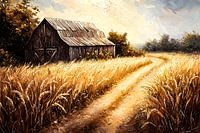 Dit prachtige ontwerp toont een rustiek tafereel van een oude houten schuur, genesteld in een gouden tarweveld. De warme, aardse kleuren en zachte penseelstreken geven een nostalgisch en serene uitstraling, perfect om een gevoel van warmte en comfort in huis te brengen. Het ontwerp ademt landelijke charme uit en brengt de rust van het platteland naar uw interieur. Een ideaal kunstwerk om sfeer te creëren in een woonkamer of eetkamer.