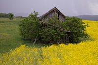 Een regenachtige dag in april met een grijze lucht. Het koolzaad is hier bijzonder mooi. In het midden van dit prachtige koolzaadveld staat een kleine oude schuur, bijna overwoekerd. Een idyllische foto met landelijke flair, genomen in de buurt van Murnau.