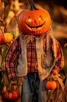 Een vrolijke herfstgroet met een stralend gloeiende pompoen die charmant tot leven is gebracht. De lachende ogen en rustieke outfit geven het tafereel een uitnodigende sfeer. Ideaal voor de keuken of woonkamer om een gezellige, seizoensgebonden sfeer te verspreiden en bezoekers te verblijden.