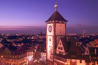 Blauw uur over de stad Freiburg, op de voorgrond het Schabentor, een van de bezienswaardigheden van Freiburg.