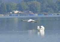 Schwan fliegt über einen anderen Artgenossen hinweg über einen See