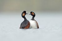 Black necked Grebes / Eared Grebes / Schwarzhalstaucher ( Podiceps nigricollis ), pair in breeding dress, courting, penguin dance, dancing, wildlife, Europe.