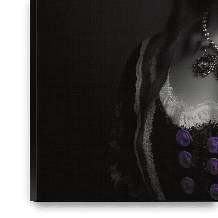 De foto toont het portret van een charmant meisje uit het Zwarte Woud in traditionele klederdracht. De foto is in zwart-wit, maar bepaalde paarse kleurelementen geven het portret een bijzondere zeggingskracht. De jonge vrouw presenteert zichzelf met een trotse houding, terwijl haar blik naar de kijker is gericht met een mengeling van…