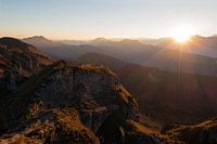 Swiss Alps, Bernese Highlands, sunrise above scenic mountains in Switzerland, break of day, magical light.