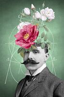 De man heeft een prachtige snor maar alle aandacht gaat toc echt uit naar de bloemen die op mysterieuze wijze uit zijn hoofd groeien.