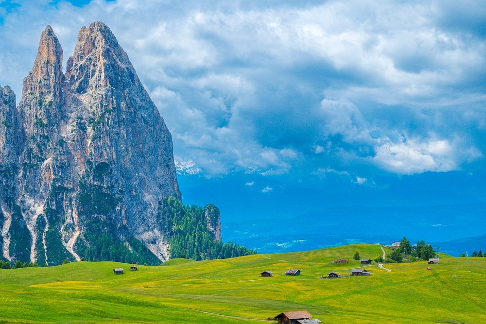 Seiser Alm of Alpe di Siusi - met Sciliar-massiefgroep op de achtergrond tijdens de lente in de Dolomieten. Gele voorjaarsbloemen in de weiden en enkele houten chalets op de hoogvlakte in de Alpen, Trentino Alto Adige, Zuid-Tirol, Italië.