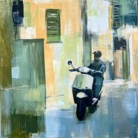 In een zacht spel van gele en groene tinten glijdt een figuur op een elegante scooter door een smal, dromerig steegje. De levendige beweging contrasteert harmonieus met de stille, verweerde muren die verhalen van vervlogen tijden vertellen. Een sfeer van levendigheid en rust omringt het moment, dat zachtjes wordt omhuld door licht.