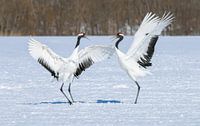 Een kleine ruzie tussen twee Japanse Kraanvogels op een winters uitziend besneeuwd veld in het zuidoostelijke deel van Hokkaido, Japan.