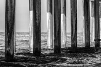 Lange, slanke pilaren strekken zich uit vanaf het zandstrand in de kalmerende uitgestrektheid van de zee onder een heldere hemel. De zwart-witfoto benadrukt de contrasten tussen licht en schaduw, terwijl het water zachtjes over de basis van de structuren kabbelt. Dit is de Scripps Pier in La Jolla, Californië. Bedankt voor je interesse…