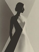 Een minimalistisch, sculpturaal portret waarin een vrouwelijk silhouet verschijnt door overlappende licht- en schaduwvlakken. De scherpe lijnen en zachte textuur geven het beeld een filmische, serene energie.
