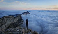 Man kijkt over een zee van wolken tijdens een rustgevende zonsopkomst in het Vercors gebergte in Frankrijk.