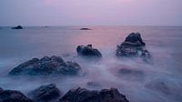 Rotsen in de zee in de blauwpaarse oranje-achtige gloed van het laatste beetje zonlicht boven de Arabische zee in India.