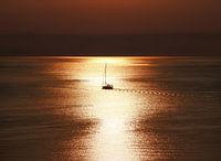 Het silhouet van een bootje op de Ionische zee tijdens een prachtige zonsopgang in Corfu. De reflectie van het zonlicht zorgt voor een warm contrast en focuspunt op je muur.