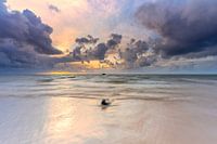 Zee zicht met een mooi lucht spel aan wolken en licht. Een kalme zee met op de voorgrond een stuk drijfhout. Kleuren van blauw naar geel oranje die samen komen tot een mooi landschapsfoto.