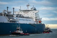 LNG tanker Gaslog Gibraltar met de tag #SeafarersDeliveringChristmas erop geschilderd. Het schip loopt de Eemshaven aan en wordt geassisteerd door Wagenborg sleepboten Waterstroom, Waterstraat en Waterlines.