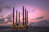 Kraanbak Seafox 4 op de Noordzee achter sleepboot Manta van Boskalis met zonsondergang.