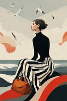 Een artistieke illustratie waarin elegantie en natuurlijke elementen samensmelten. Een vrouw in een zwarte coltrui en gestreepte rok zit sereen aan de kust, met een cognackleurige handtas naast zich. De zachte pasteltinten van de wolken contrasteren prachtig met de zwart-witte kledingkeuze, terwijl meeuwen sierlijk door de lucht zweven boven een golvende zee.