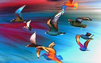 Abstract schilderij met kleurrijke zeemeeuwen in vlucht