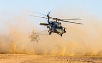 De afbeelding toont twee SH-60 Seahawk-helikopters die boven een woestijnlandschap vliegen. De helikopters veroorzaken een aanzienlijke hoeveelheid opwaaiend stof terwijl ze dicht bij de grond zweven. De scène is dynamisch, met de draaiende rotoren van de helikopters die een gevoel van actie en beweging creëren.