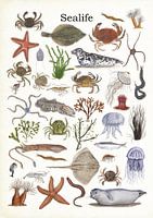 Het leven in de zee op een oude schoolplaat, illustraties Jasper de Ruiter
