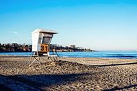 Een strandwachttoren staat op het zandstrand met een rustige oceaan en kliffen in de verte in zicht op La Jolla Shores Beach, San Diego, Californië.