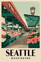 Een levendige drukte wacht op de kijker met zijn uitnodigende kleurenpracht en de charmante marktplek die pulseert in het hart van Seattle. Vers fruit en groenten nodigen uit om te blijven hangen, vergezeld door de nostalgische klok die het alledaagse leven vertraagt. Deze nostalgische blikvanger geeft de keuken een frisse, stedelijke flair en inspireert tot culinaire avonturen.