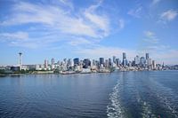Verlaten van Seattle op het cruiseschip Norwegian Spirit op weg naar Alaska. Het is altijd een mooi gezicht om een skyline van een stad te zien en Seattle heeft een mooie skyline. Links is de Space Needle te zien.