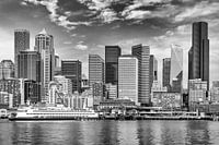 Seattle is een dynamische metropool in het noordwesten van de Stille Oceaan in de VS, met diverse wijken en een adembenemend kustlandschap. Monochrome impressie van de waterkant in Seattle met wolkenkrabbers in het centrum.