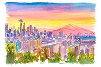 Seattle skyline in de schemering met Mount Rainier in de schijnwerpers