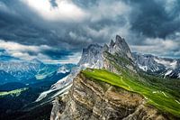 De dramatische kliffen van het Seceda gebergte in de Dolomieten tijdens een bewolkte dag met uitzicht op de Odle groep. De Seceda piek in de Dolomieten Alpen, Zuid-Tirol (Alto Adige), Italië is een populaire plek voor toeristen en is bereikbaar met de Seceda Seilbahn vanuit Urtijëi.