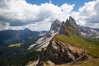 Prachtige uitzichten en steeds wisselende wolken luchten in het fantastische berglandschap in Zuid Tirol. De afwisseling tussen groen en steen is bijzonder op deze steile piek van de Dolomieten