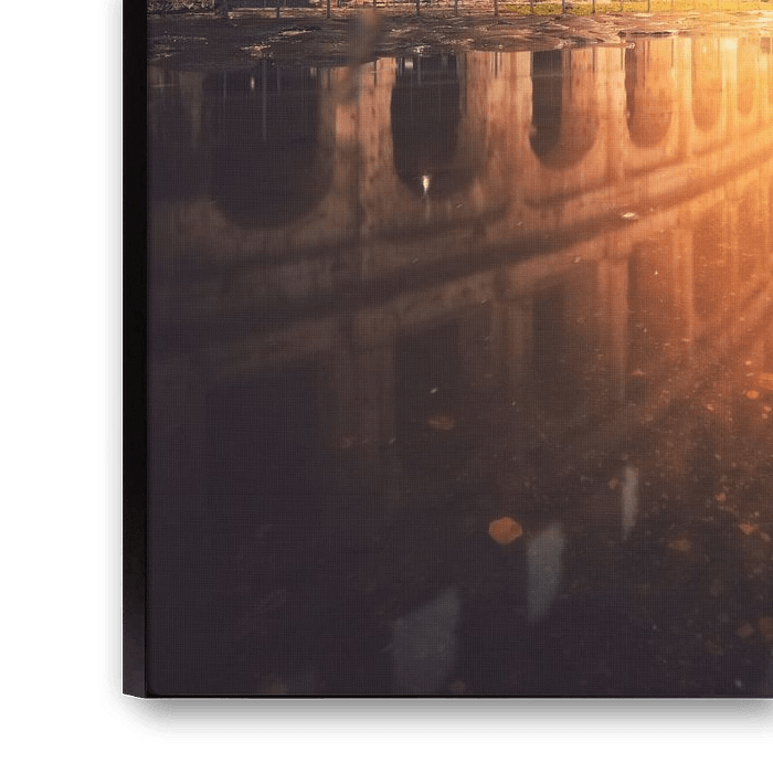 Een deel van het Colosseum in Rome, met een grote plas reflectie en zonsopgang of lichtinval. Buiten.