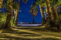 Zie de zee. Een prachtig schouwspel van palmbomen, verlichting, strand en zee aan het einde van het blauwe uurtje. De verlichting tekent mooit op het zand. De foto is genomen in de baai van St Tropez een uurtje na zonsondergang.