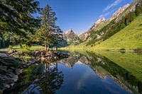 De idyllische Seealpsee in de Zwitserse Alpen na zonsopgang. De Säntis, herkenningspunt van de regio Appenzell, wordt weerspiegeld in het glazige meer.