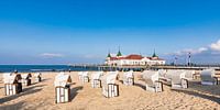 Strandstoelen op het strand voor de historische pier Ahlbeck in de badplaats Ahlbeck op het eiland Usedom.