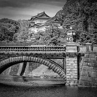 Impressie van de iconische Seimon Ishibashi en Nijubashi bruggen tegen de achtergrond van de Tsukimi Yagura uitkijktoren van het keizerlijk paleis in Tokio. De bruggen steken elegant uit over de slotgracht van het paleis. Beide bruggen zijn indrukwekkende voorbeelden van traditionele Japanse architectuur, met hun gebogen vormen en stevige stenen constructies. De Tsukimi Yagura rijst op in de achtergrond met zijn witte gevel en zwarte dakelementen, die typisch zijn voor Japanse kastelen. De yagura past harmonieus in het omringende landschap, dat wordt gekenmerkt door goed onderhouden bomen en het kalme water van de slotgracht. Het heldere, zonnige weer laat de kleuren stralen en benadrukt de architectonische details van de bruggen en de wachttoren. De hele scène straalt een tijdloze elegantie en rust uit die de historische en culturele rijkdom van het keizerlijk paleis benadrukt. Klassieke zwart-wit impressie.