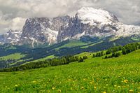 Seiser Alm of Alpe di Siusi - met op de achtergrond de berggroep Sassolungo - Langkofel tijdens de lente in de Dolomieten. Gele voorjaarsbloemen in de weiden en enkele houten chalets op de hoogvlakte in de Alpen, Trentino Alto Adige, Zuid-Tirol, Italië.