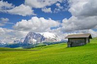 Seiser Alm of Alpe di Siusi - met op de achtergrond de berggroep Sassolungo - Langkofel tijdens de lente in de Dolomieten. Gele voorjaarsbloemen in de weiden en enkele houten chalets op de hoogvlakte in de Alpen, Trentino Alto Adige, Zuid-Tirol, Italië.